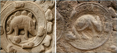Now let’s discuss the paper’s actual arguments against the stegosaur interpretation. It rehashes the old contention that the apparent stegosaur plates are background vegetation, filling out the scene in the circle (roundel). But the idea that these plates are just pedals “cupping” the creature makes no sense. Proper “cupping” would go completely around the carving, as in the defaced Buddhist roundels near the stegosaur and on other columns. [Figure 1] Instead, the plates are just on top and follow the contour of the animal’s back, from the neck to the tail. They are not coming from some central plant stalk in behind the animal. Notice that the “petal” by the tail does not continue behind the animal, between the upper tail and the back leg.
