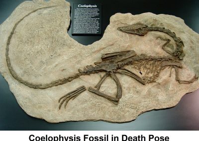 When a complete skeleton is found intact, it provides much more information to the paleontologist than a loose pile of bones. One of the striking characteristics of many of these connected skeletons is that they exhibit a peculiar contorted position popularly called the “death pose.” This pose of many fossilized dinosaurs, with wide-open mouth, head thrown back and recurved tail, likely resulted from the agonized death throes typical of brain damage from asphyxiation, according to paleontologists. “An extreme, dorsally hyperextended posture of the spine (opisthotonus), characterized by the skull and neck recurved over the back, and with strong extension of the tail, is observed in many well-preserved, articulated amniote skeletons (birds and other dinosaurs, pterosaurs, and at least placental mammals). Postmortem water transport may explain some cases of spinal curvature in fossil tetrapods, but we show how these can be distinguished from causes of the opisthotonic posture, which is a biotic syndrome.” (Faux, Cynthia Marshall, Padian, Kevin, “The Opisthotonic Posture of Vertebrate Skeletons: Postmortem Contraction or Death Throes?,” Paleobiology, Spring 2007.)