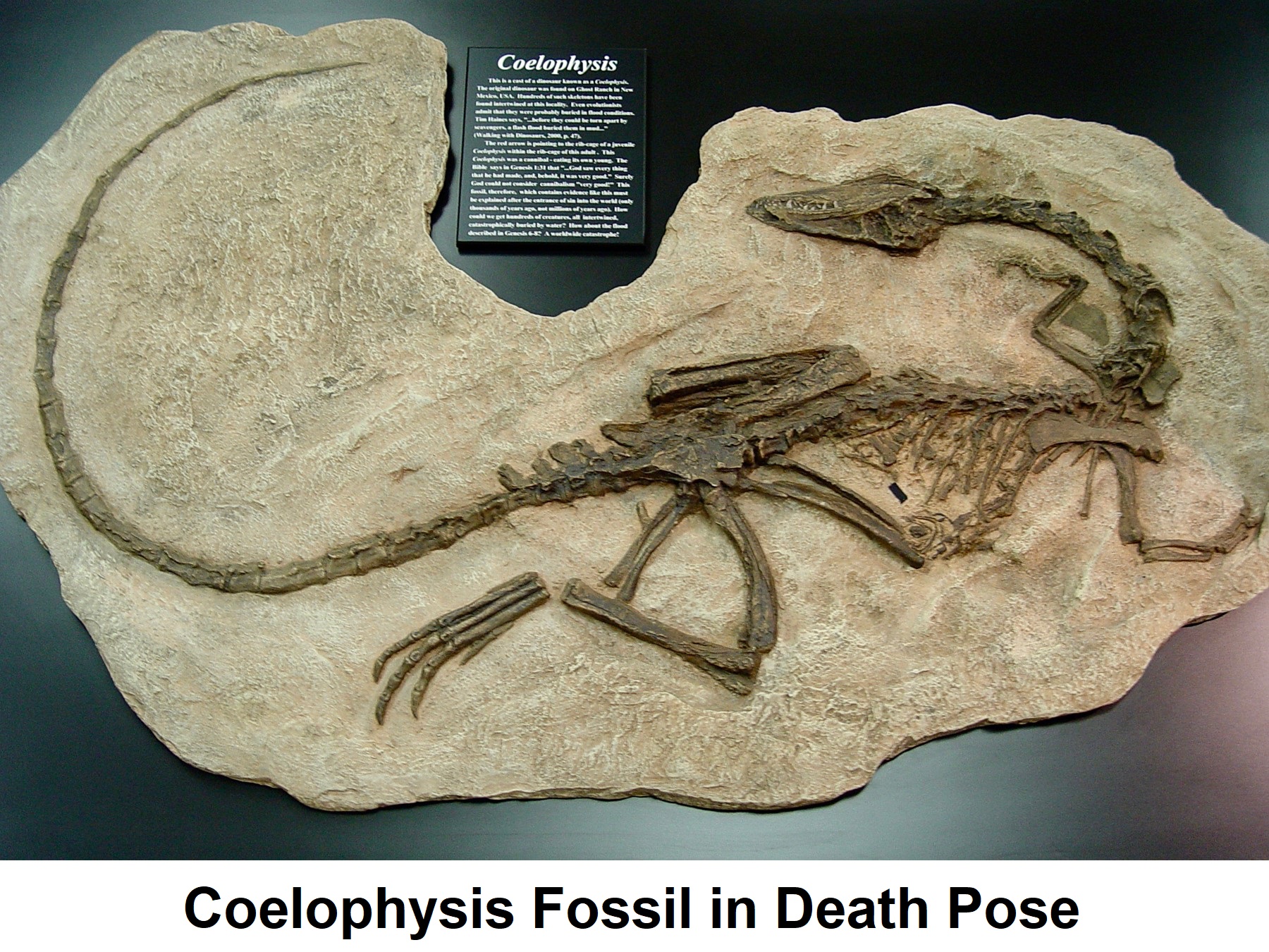 Here are many pictures of popular dinosaurs exhibiting the typical death pose (click for a better look). Above is an image of a Spinophorosaurus fossil from National Geographic. The dinosaur’s spinal column is so contorted as to almost form a circle! Creationist Ian Juby has collected a large sample of such cases (including some of the pictures on this page) and presents this as evidence of fossilized creatures meeting their demise during the Genesis Flood. “I probably have close to a hundred examples now of the death pose, both in land animals and marine organisms. Obviously the marine organisms didn’t lay out in the desert and shrivel up…In fact, this is a sign lifeguards look for, to spot if someone is drowning–even people, when they are drowning, pull their heads back.” (Private correspondence, used with permission, 2009.)